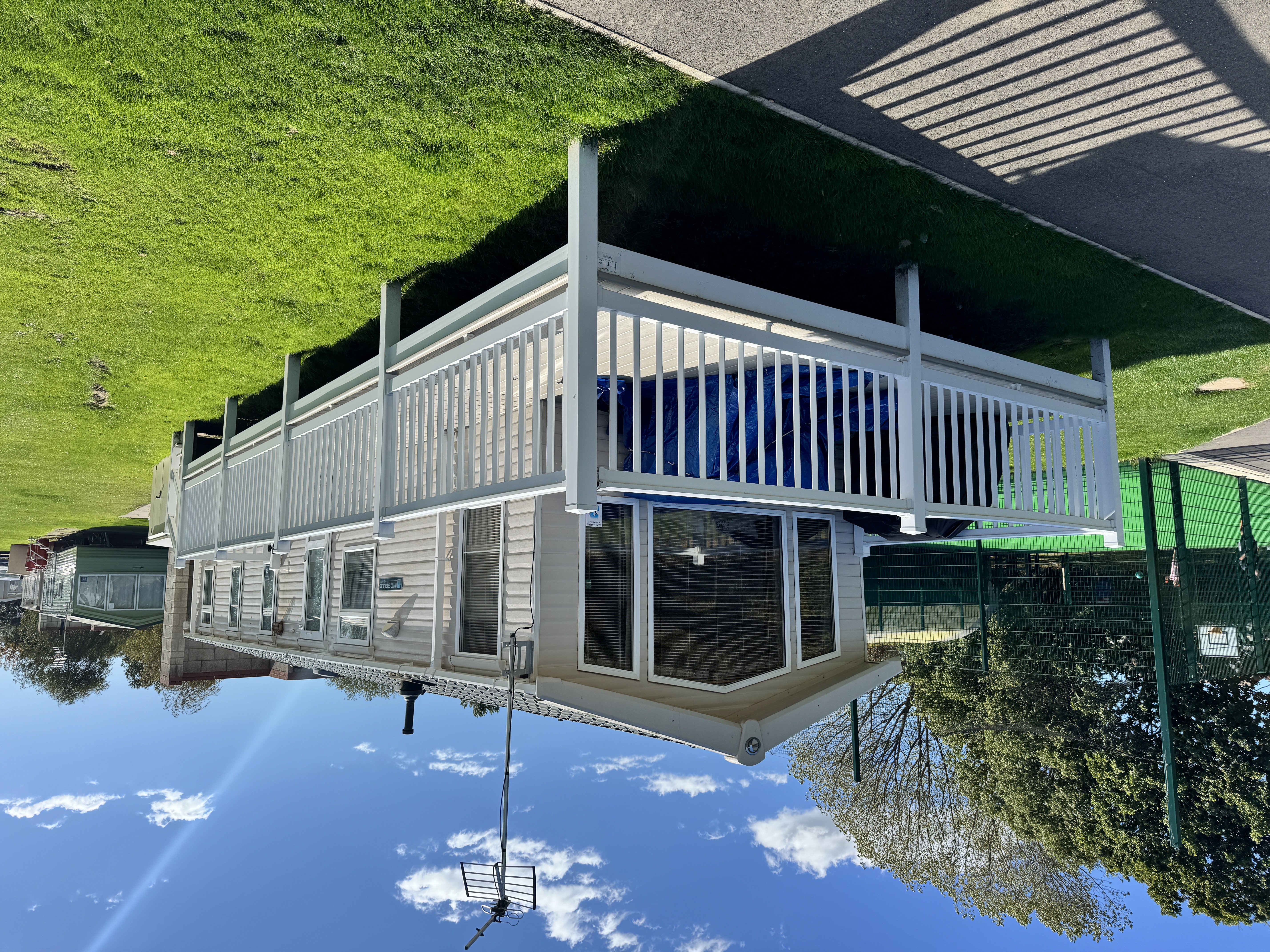 This wraparound decking has a long walkway front 16ft x 8ft with a 30ft x 4ft walkway with steps and a gate