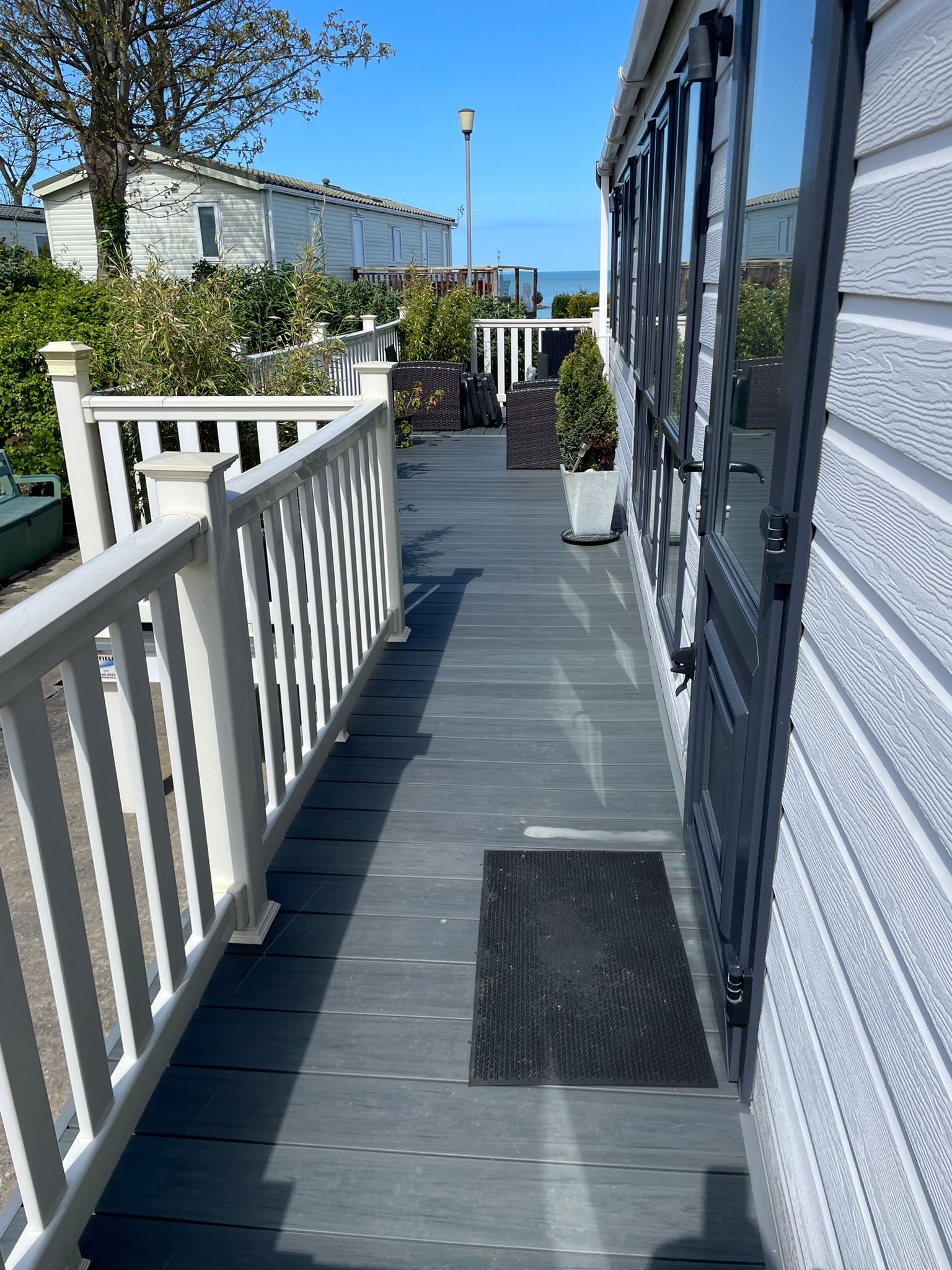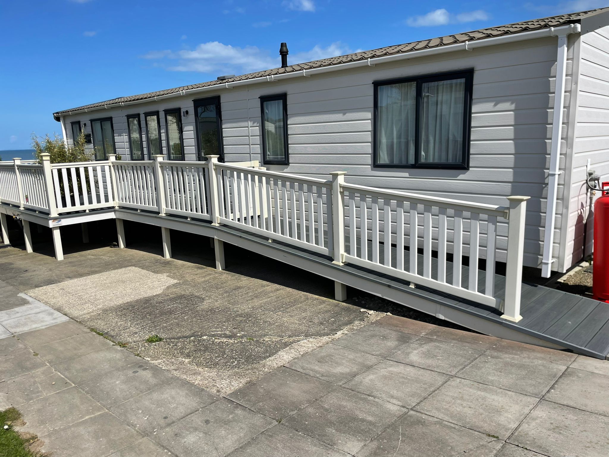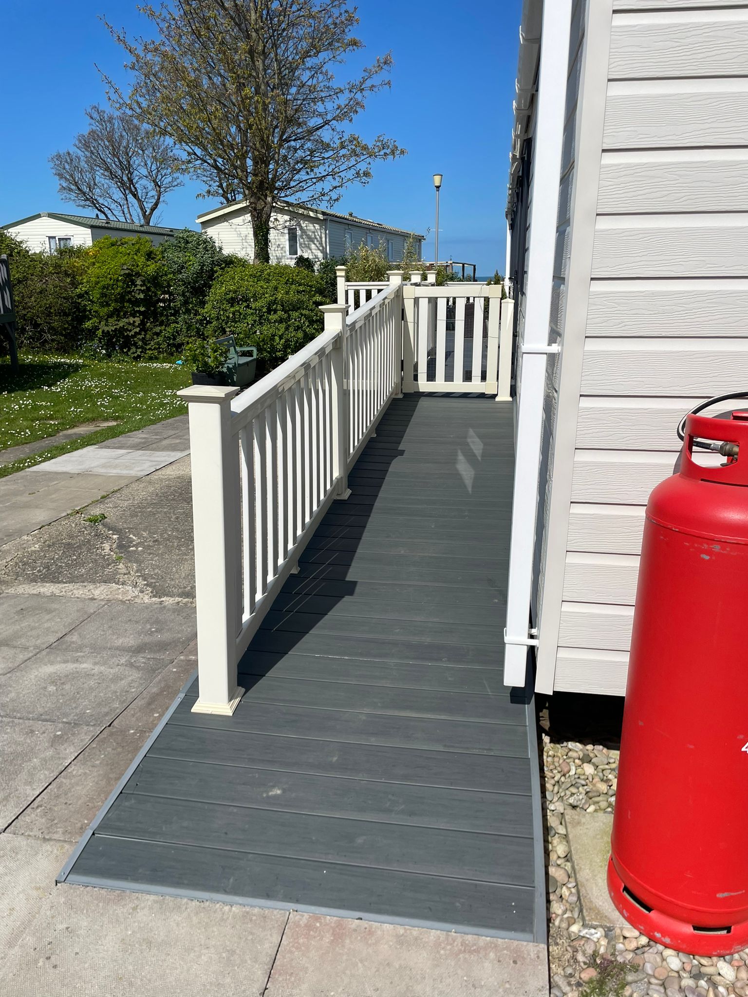 Size: Front 22ft x 8ft side sundeck 19ft x 8ft leading down onto the walkway 11ft x 4ft then onto a ramp 17ft x 4ft with a gate at the top of the ramp